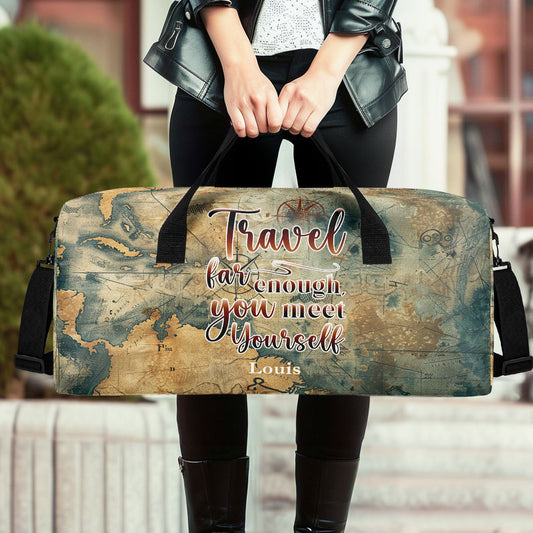 Travel Far Enough You Met Yourself - Personalized Minimalist Duffle Bag SBMDBHA35