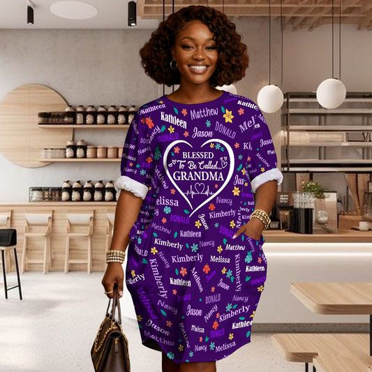 Blessed To Be Called Grandma - Personalized AOP Loose Pocket Oversize T-Shirt Dress