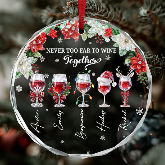 Never Too Far To Wine Together - Personalized Round Shaped Glass Ornament