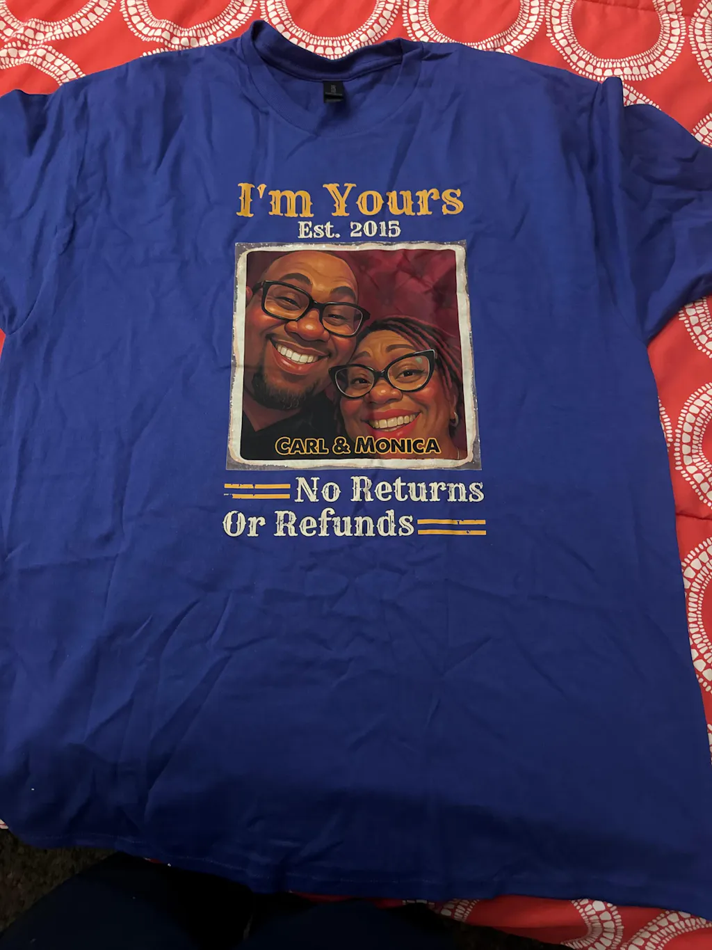 Hubby and I love the shirts and look forward to wearing them on vacation. Funny thing is my brother said “No refunds No returns” at our wedding 10 years ago.