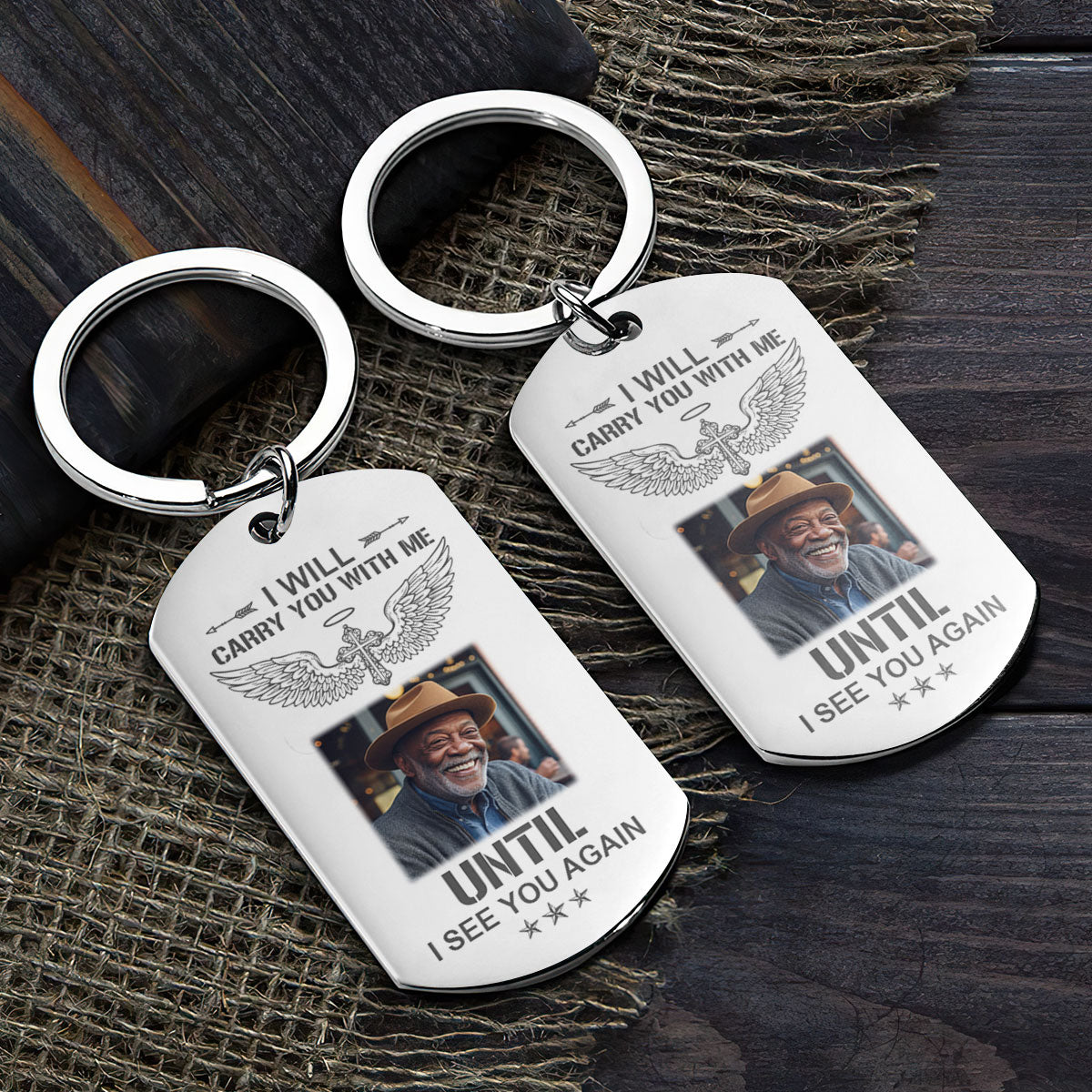 - Feature: Double sided keychain, engraved text and printed image with a protection layer.